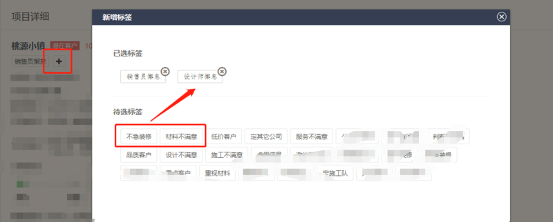 客户单击项目详细时,会跳转到项目详细页面。用户单击红框中的加号,页面弹出选择标签页面。用户单击待选标签中的标签,当前标签会被保存到数据库中。