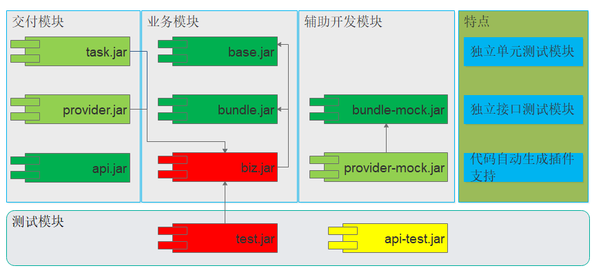 - biz.:业务模块,依赖base和bundle模块,除了bundle中service的实现会集中在这个模块,还包括一些没有定义在接口和任务层面的service及其实现;此外还包括一些工具类、与其他第三方的通信类、自定义的持久层访问类,错误码常量等