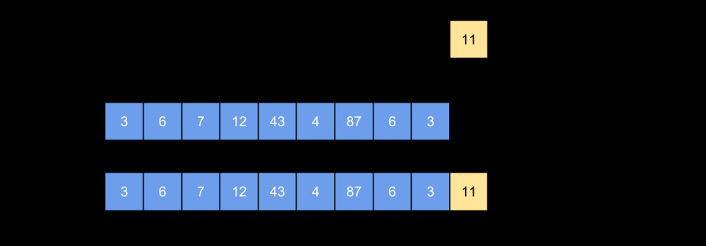 从上图可以看出,将新元素插入至序列指定位置,需要先将该位置及其之后的元素都向后移动一位,为新元素腾出位置。这个操作的时间复杂度为 O(N) ,频繁移动元素可能会导致效率问题,特别是集合中元素数量较多时。在日常开发中,若非所需,我们应当尽量避免在大集合中调用第二个插入方法。