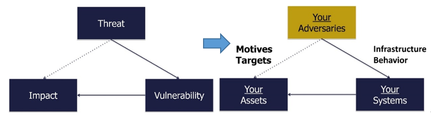 为了应对这种情况,Freddy认为可以建立威胁模型来对问题进行分析。从基于风险的模型开始着手,威胁会利用漏洞进行入侵,入侵后会造成勒索、数据窃取等不良影响。把研究问题的层次进一步提升,模型的威胁上升到其执行主体–攻击者,攻击者会利用漏洞执行一些操作对系统进行入侵,入侵之后的关键的目标在于对有价值的资产进行恶意操作。