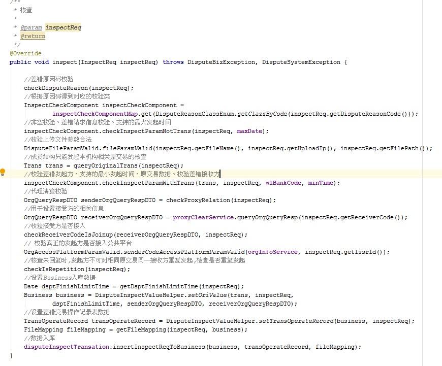 再回过头看主流程执行的代码,其disputeType的值为inspectTran时,便会根据拓展实现类中的逻辑,取配置文件中对应的com.epcc.risk.api.biz.base.spi.disputeTran.InspectTran为实现类进行处理,disputeReasonCode值为reasonCode2201时,同样根据差错原因码的拓展实现类逻辑,取com.epcc.risk.api.biz.base.spi.disputeReasonCode.inspect.ReasonCode2201为实现类进行处理。当新增了差错类型或差错原因码时,无需改动主逻辑代码,直接在配置文件中指定新增的差错类型和差错原因码的实现类即可。