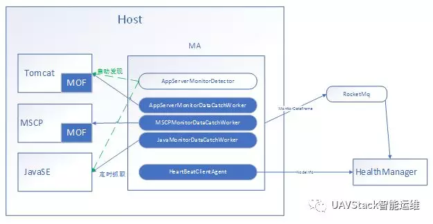 在UAVStack中,应用数据的归集功能通过MA来实现。MA可以定时抓取MOF中的实时信息,自动发现Tomcat、MSCP、JavaSE中的信息,并通过数据分析得出监控信息,通过RocketMQ将归集后的数据发送到HM进行存储,并提供查询功能。