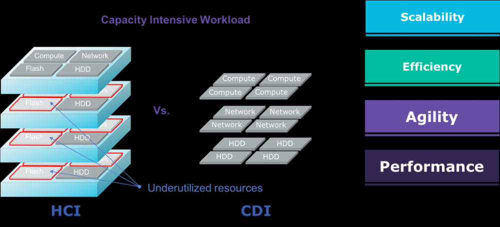 虽然HCI将计算、存储和网络资源整合在单一虚拟化系统中,但它们并非没有效率。例如,通过处理器定义可扩展性限制和进行资源访问。HCI提供了额外的处理器,用以添加存储、内存或网络方面的更多资源,即使这些处理器不是必需的。这导致数据中心架构师尝试构建灵活的基础架构,但使用的却是缺乏灵活性的构块。