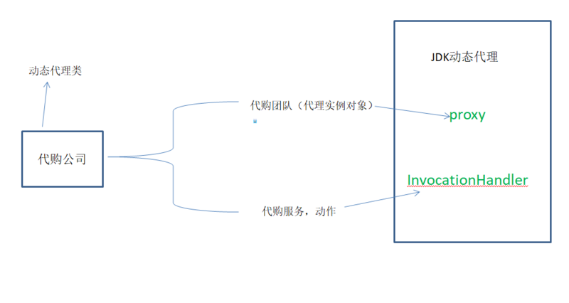 根据我们此例子里面来说,动态代理就类似一个代购公司,可代购所有产品,需要购买哪个产品的时候就实例化一个真实对象(如测试类需要男性用品则将接口引用指向真实对象AManFactory),根据真实对象创建代理对象来执行具体的方法,图解如下: