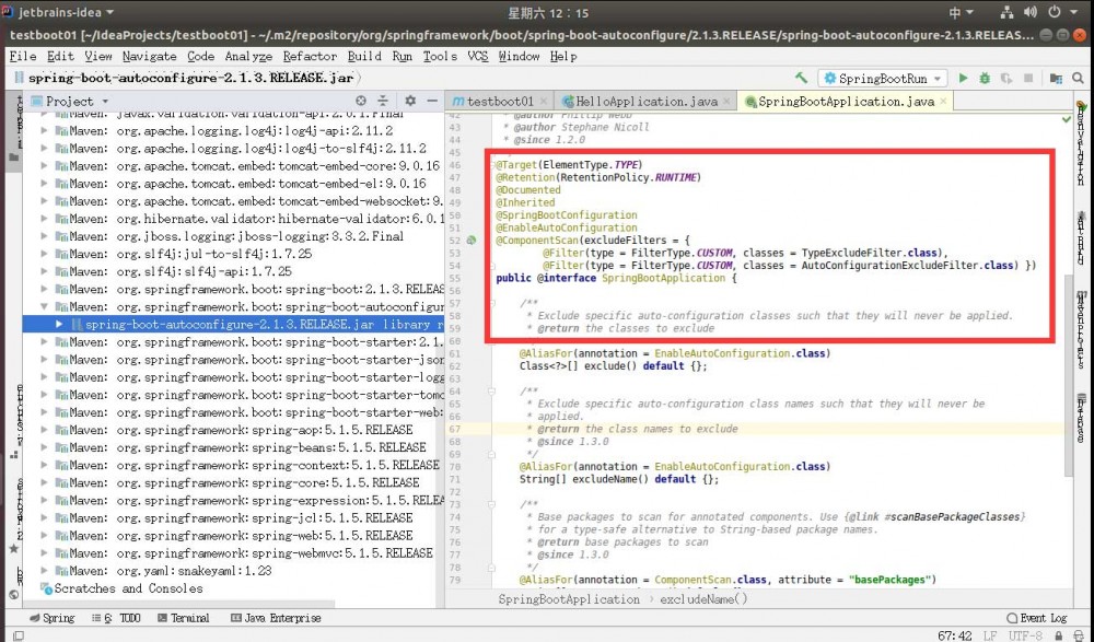 可以看到,该注解本身又被其它注解所叠加。其中最重要的注解是@SpringBootConfiguration和@EnableAutoConfiguration。第一个支持表明当前类相当于是一个配置文件,第二个注解表明当前应用程序支持自动配置,即允许SpringBoot来提供对web应用的配置。这里就要注意了,我们说SpringBoot看不到配置文件,不是真的就没有配置文件了,而是SpringBoot帮我们完成了配置。