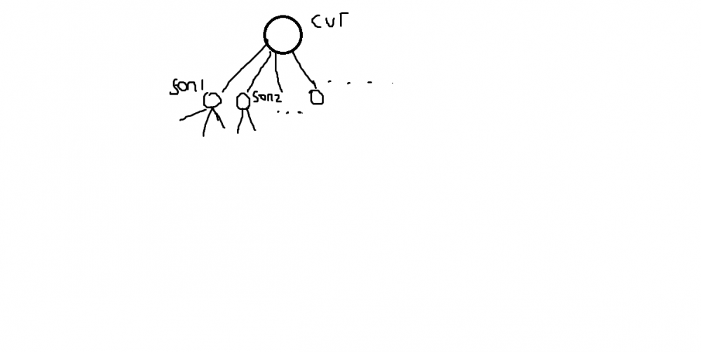 假设当前遍历到的结点是$cur$,以$cur$为根有一颗多叉树,$cur$的子节点分别为$son1,son2,son3,...$,定义$v[cur]$为以$cur$为根所得到的最大权值和,$w[cur]$为$cur$这个结点的权值,假设所有的$son$中,只有$v[son1],v[son2]$大于$0$,那么$v[cur]=v[son1]+v[son2]+w[cur]$