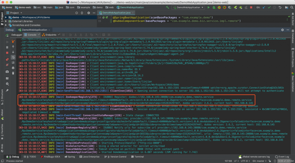 ④ 在 DemoWebApplication 入口类中增加 Dubbo 接口实现类包扫描,设置 @DubboComponentScan 注解中的 basePackages 值为 com.example.demo.biz.service.impl.remote