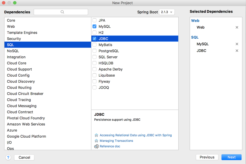 JdbcTemplate基本用法实际上很简单,开发者在创建一个SpringBoot项目时,除了选择基本的Web依赖,再记得选上Jdbc依赖,以及数据库驱动依赖即可,如下: