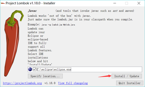lombok.jar 包,下载地址: https://projectlombok.org/download.html cmd 窗口,切到 Lombok 下载的目录,运行命令: java -jar lombok.jar ,会出现如下界面: