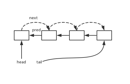 同步器使用CLH队列来维护排队的线程,CLH队列说白了就是一个单向链表,特性是后一个节点的状态是由前一个节点的状态决定的,每个节点都有一个 pred 指针指向前一个节点, AbstractQueuedSynchronizer 在原生的CLH队列基础上进行了优化,加入了一个 next 指针,指向后继节点,用于提高寻找后继节点的性能,这就形成了一个双向链表。由于没有更新两个 volatile 的变量的CAS方法,所以 next 变量为 null 的时候并不表明没有后继节点,因为有可能一个节点入列的时候更新完 pred 指针,还没来得及更新 next 指针。具体结构如下: