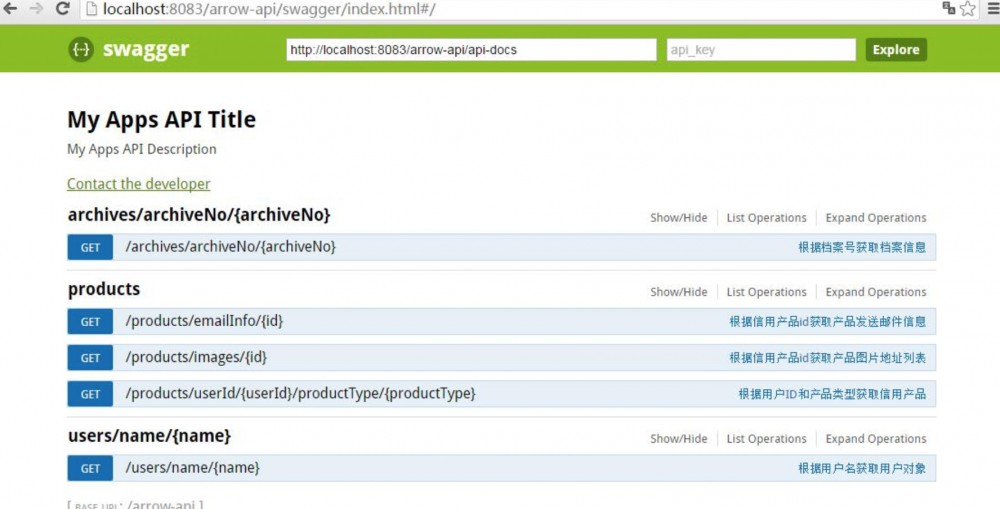 修改swagger/index.html文件,默认是从连接http://petstore.swagger.io/v2/swagger.json获取 API 的 JSON,这里需要将url值修改为http://{ip}:{port}/{projectName}/api-docs的形式,{}中的值根据自身情况填写。比如我的url值为:http://localhost:8083/arrow-api/api-docs