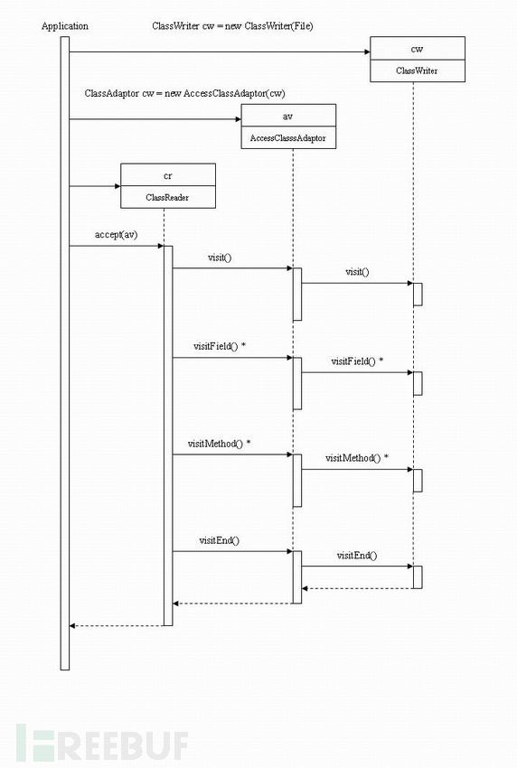 关于ASM的介绍以及使用,大家可以看一下下面的介绍: ASM官方操作手册 , AOP的利器:ASM3.0介绍 关于ASM的时序图,我这边引用一下IBM上的一张图: