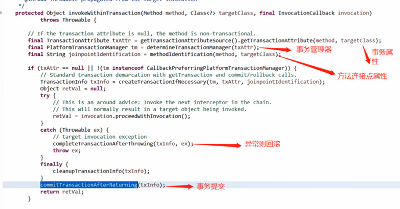 TransactionInterceptor是事务拦截器,所有带有@Transactional注解的方法都会经过拦截器invoke方法拦截,点进方法里面可以发现代码如下: