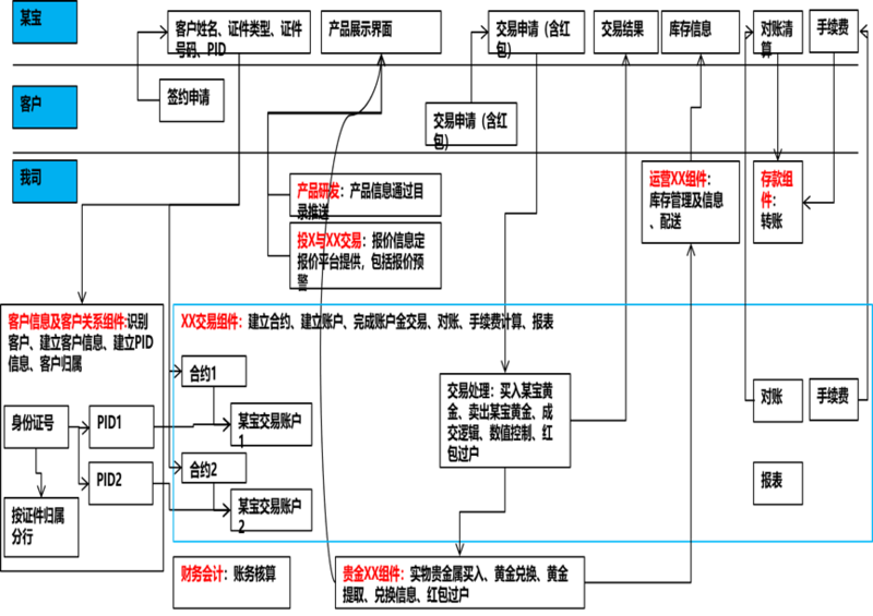 需求的主要内容包括:为客户建立虚拟账户,用于记录客户买卖交易、持仓等;支持使用某宝黄金发送红包(黄金份额);红包的账务性处理、红包资金的支付结算及划转;支持黄金实物兑换;支持黄金转赠;销售数据提取、报表统计、实物提取配送数据交互以及相应的核算规则等。