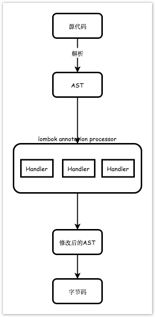 委派给 handler 时,Lombok Annotation Processor 会提供一个被注解节点的Abstract Syntax Tree (AST)节点对象,它可能是一个方法、属性或类。在 handler 中 可以对这个 AST 进行修改,之后编译器将从被修改后的 AST 生成字节码。