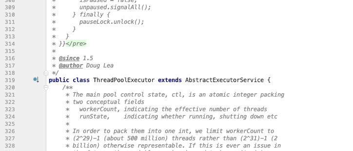 在IDE中,例如IDEA里,我们可以点击我们样例代码里的 ThreadPoolExecutor 类跳转到JDK中 ThreadPoolExecutor 类的源代码。在源代码中我们可以看到很多 java.util.concurrent 包的缔造者大牛“Doug Lea”所留下的各种注释,下面的图片就是该类源代码的一个截图。