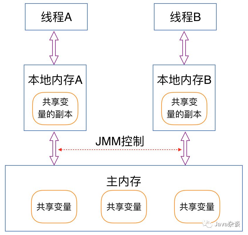Java内存模型定义了线程和内存之间关系:线程之间的共享变量存储在主内存中,每个线程都有一个私有的本地内存,本地内存中存储了该线程以读 / 写共享变量的副本。本地内存是 JMM 的一个抽象概念,并不真实存在;它涵盖内存、缓存、寄存器以及其他的硬件和编译器优化。Java的内存模型抽象如下: