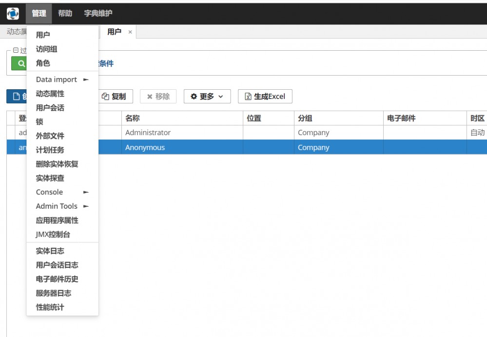中文语言包支持 CUBA 6.10.X 及 7.X 系列,并已加入 CUBA 官方主 Maven 仓库,因此不需要在构建文件中额外指定 Maven 仓库即可引用中文语言包。下图是加载并使用中文语言包后的系统界面。