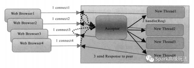 该模型的整体思路是有一个独立的 Acceptor 线程负责监听客户端的链接,它接收到客户端链接请求之后为每个客户端创建一个新的线程进行链路处理,处理完成之后,通过输出流返回应答给客户端,线程销毁。这就是典型的一请求一应答的通讯模型。