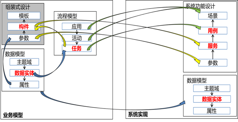 可以在业务模型中再增加一个面向组装式设计的表达,并通过这一表达形成面向业务实例或者产品的组装式设计,这种方式至少在金融领域可以有效。设计逻辑如下: