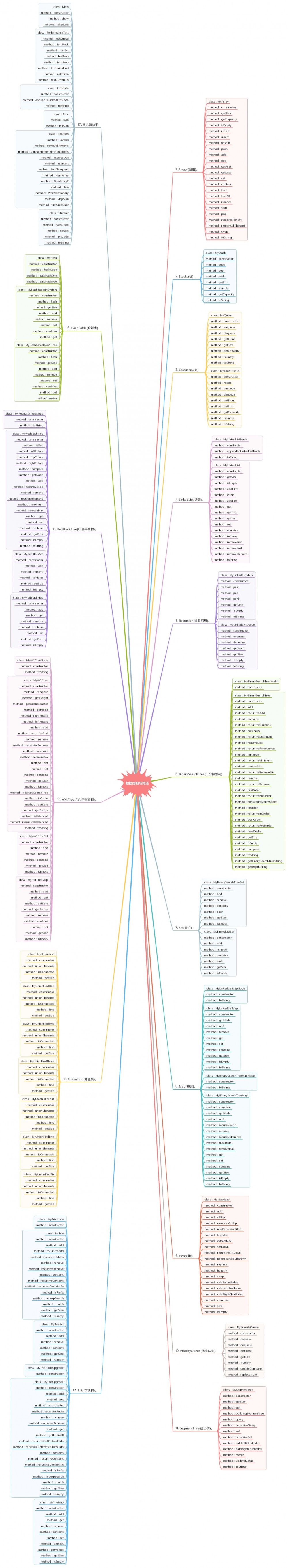 Arrays(数组)、Stacks(栈)、Queues(队列)、LinkedList(链表)、Recursion(递归思想)、BinarySearchTree(二分搜索树)、Set(集合)、Map(映射)、Heap(堆)、PriorityQueue(优先队列)、SegmentTree(线段树)、Trie(字典树)、UnionFind(并查集)、AVLTree(AVL 平衡树)、RedBlackTree(红黑平衡树)、HashTable(哈希表)