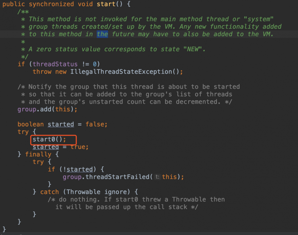 调用start()方法,实际运行的是start0方法,方法声明如下: