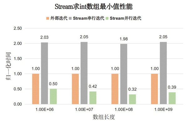 测试内容:找出整型数组中的最小值。对比for循环外部迭代和Stream API内部迭代性能。