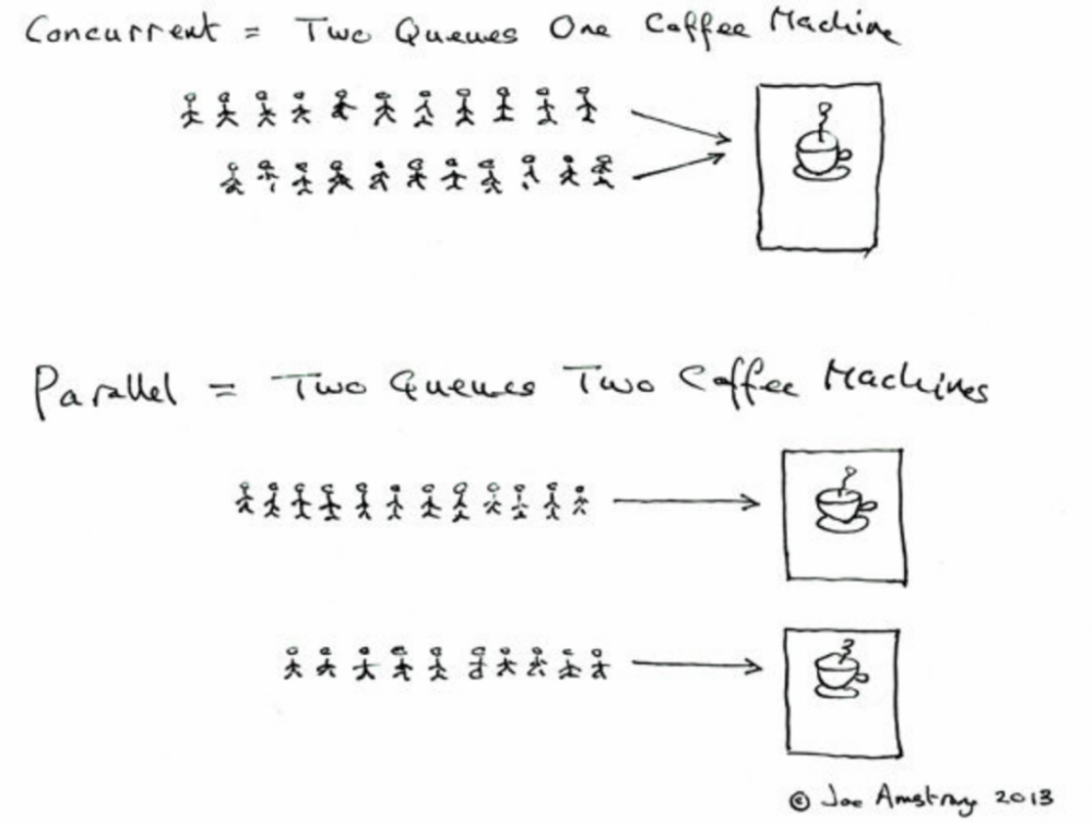 [4] 中给出了并发(Concurrent)和并行(Parallel)的区别,并发单CPU看起来“同时干多件事”,而并行则是不同任务在不同CPU上同时进行,互不抢占。