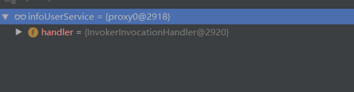 这里的 infoUserService 就是一个代理对象,比如像 proxy@2903 这种。当然了,它必然会包含一个 InvocationHandler ,如下所示: