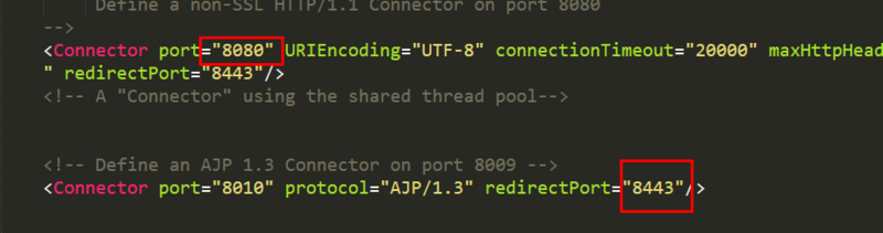 1.改端口:8080改成80,8443改成443。 所有的redirectPort="8443"都要改成redirectPort="443"