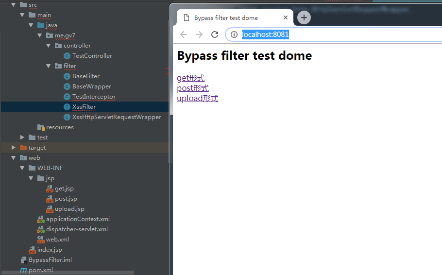 由于审计的代码属于敏感信息,我编写了一个和审计场景几乎一样的测试Demo用于本文的研究。测试Demo有get,post和upload页面用于测试Java过滤器对三种类型请求数据包的过滤情况。