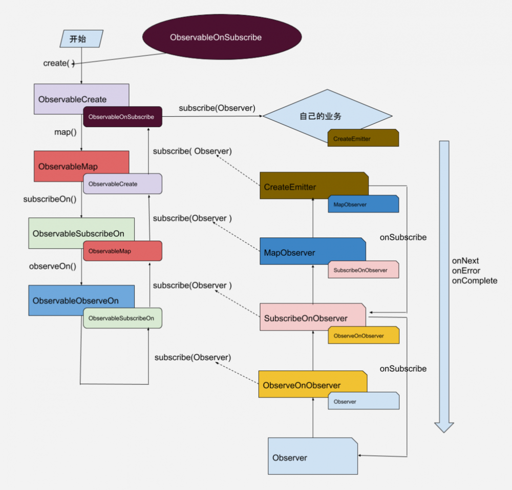 这个地方的运行线程已经被切换了,他又开始往上一层层的去订阅,所以 create(new ObservableOnSubscribe(){})这个匿名实现接口运行 subscribe 的线程运行环境都被改变了,再去调用 onNext() 等方法线程环境也是被改变的