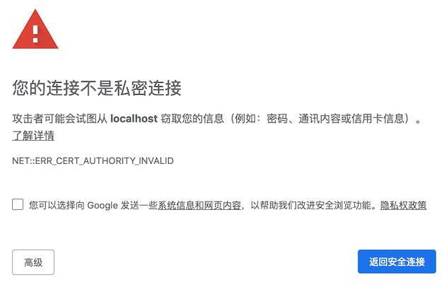 这个错误实际上就是在告诉你这个证书不可信任,可能是一个伪造站点,让你小心点儿。如果这个证书由权威CA签发,那么就没有这个问题了。但是权威CA签发的证书要求申请人拥有域名,如果你这个服务是内部使用的没有域名,那就只能自己签发了。那么如何解决上面的问题呢?你得把自己签发的证书加入到信任CA证书清单里。
