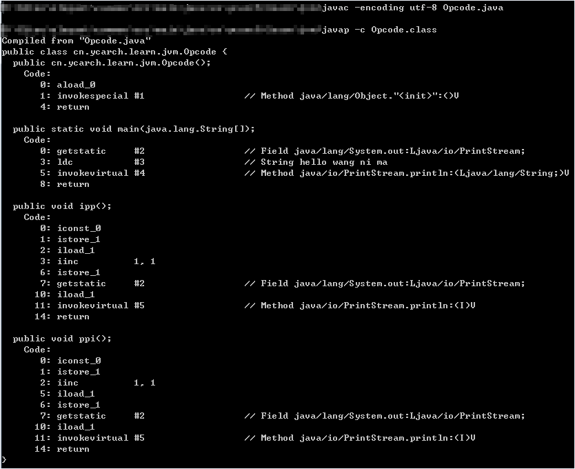 我们用javac编译上面的Opcode.java,然后“javap -c”查看字节码:
