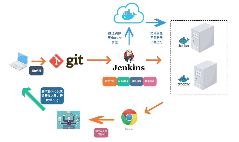 前段时间写了一篇 初创团队持续集成的落地与实现 ,主要用python接收gitlab的push请求,然后调用不同的shell脚本来实现。本文将使用基于Jenkins+Docker来实现另一套的自动化CI/CD的代码发布流程,至于jenkins和docker是什么这里就不多说了,能找到这篇文章的应该都知道他们是干什么用的,下面是整体的流程和部署。