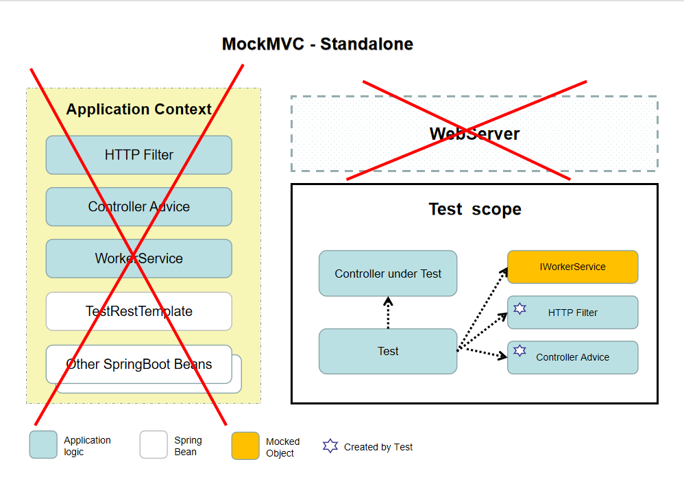 使用MockMVC Standalone模式测试对Controller层进行测试不会使用任何Spring容器,Controller层所依赖的其他服务均是mock出来的,也就是说除了Controller层的逻辑,其他相关数据都是模拟的。描述如下图: