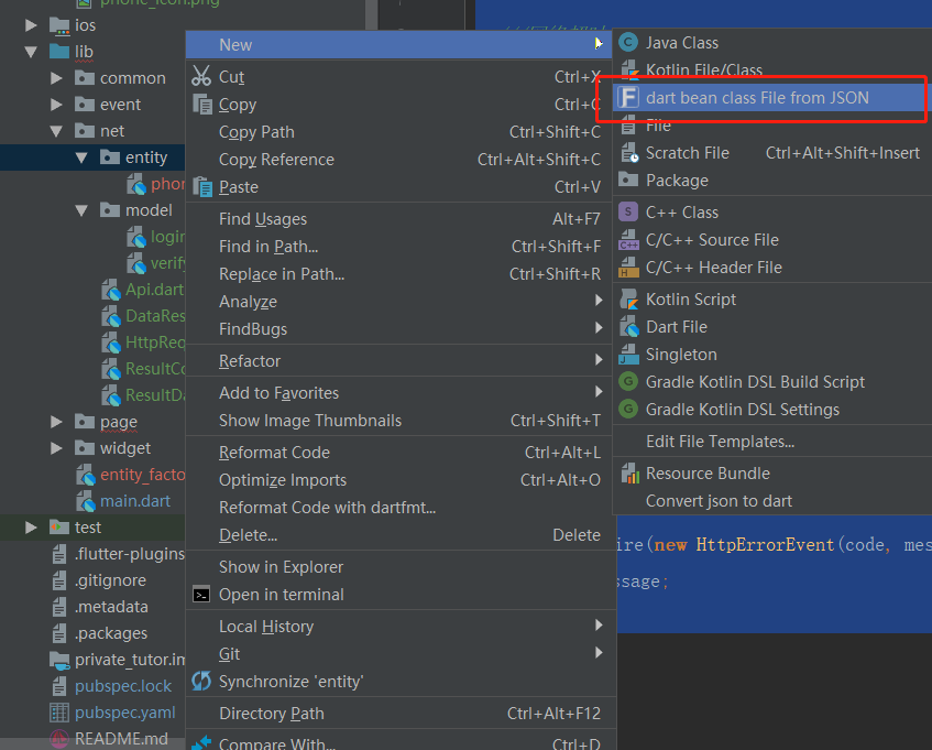 New -> dart bean class File from JSON 复制代码