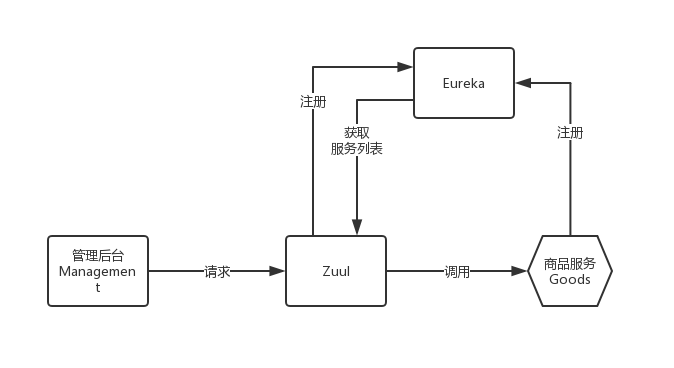现在的结构非常简单,管理后台向 Zuul 做的网关发送对商品服务的请求,Zuul 本身注册在 Eureka 做的注册中心上,并且从注册中心获取注册的服务列表,然后把请求转发给商品服务。
