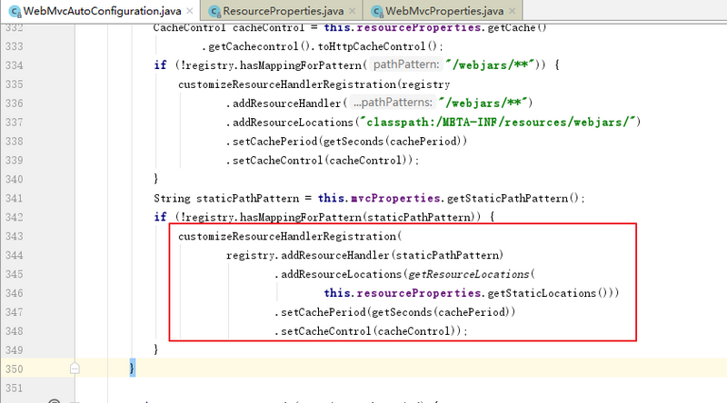 首先我们在 WebMvcAutoConfiguration 类中看到了 SpringMVC 自动化配置的相关的内容,找到了静态资源拦截的配置,如下: