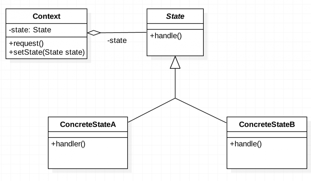 1)Context(环境类):环境类拥有各种不同状态的对象,作为外部使用的接口,负责调用状态类接口。 2)State(抽象状态):抽象状态既可以为抽象类,也可以直接定义成接口。主要用于定义状态抽象方法,具体实现由子类负责。 3)ConcreteState(具体状态类):具体状态类为抽象状态的实现者,不同的状态类对应这不同的状态,其内部实现也不相同。环境类中使用不同状态的对象时,能实现不同的处理逻辑