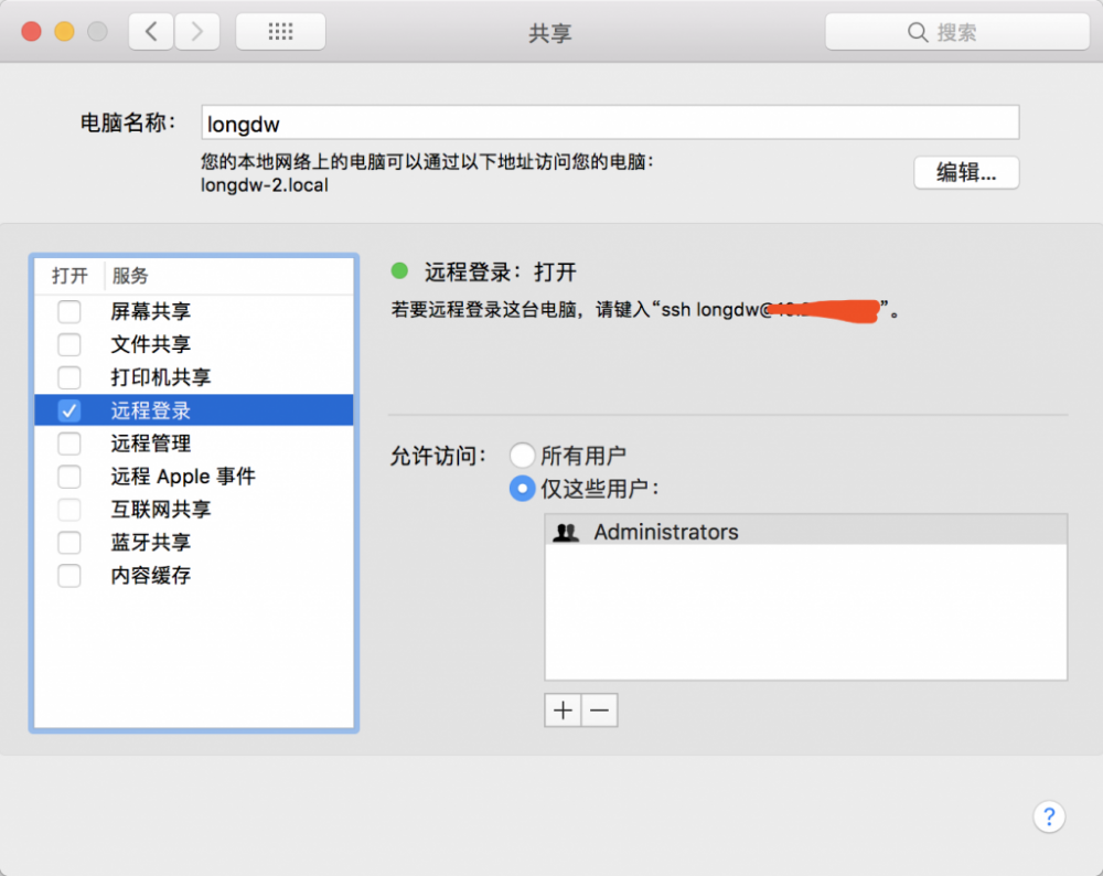 在 系统偏好设置 > 共享 中开启 远程登录 ,如下图