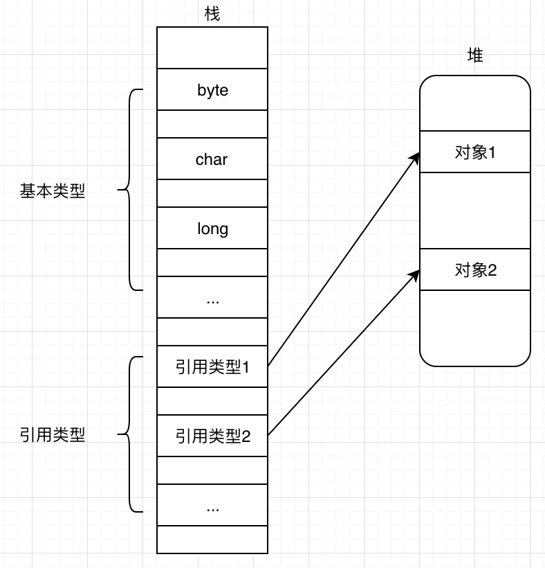 引用类型指向一个对象,它与 C++ 的指针非常相似。但 C++ 的指针可以指向基本类型和类对象,而 Java 的引用只能指向类(枚举、接口等)对象。Java 中对象本身在堆上分配,而引用类型在栈上分配,其内存地址中保存的是对象在堆中的地址。两种类型在内存中的布局如下: