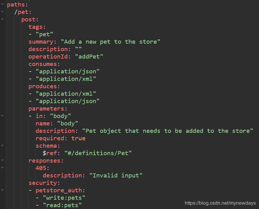这里为什么使用引用?因为post 是新增一条数据,那么就需要向api提供一个对象,对象中的键值对可能很多,所以先在后面定义了一个Pet模型,然后再这里引用即可,有人说为什么不再这里定义,因为其他地方也需要引用这个模型