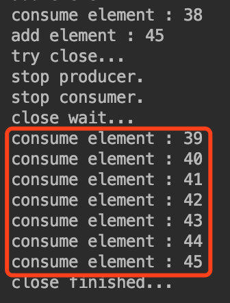 假设以下场景,有个生产者往内部队列发消息,有个消费者读取队列消息并执行。当我们停止服务的时候,希望队列的消息都能正常处理完成,代码示例如下: