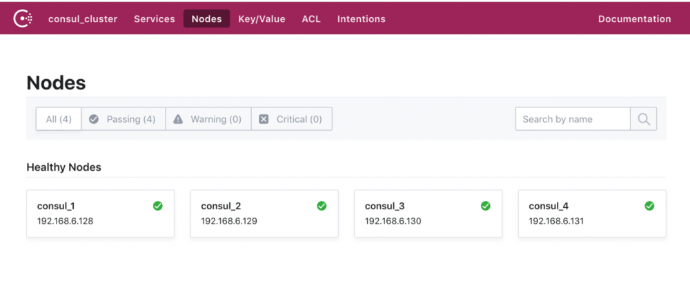 $ consul members --http-addr 192.168.6.128:8500 Node Address Status Type Build Protocol DC Segment consul_1 192.168.6.128:8301 alive server 1.4.0 2 consul_cluster <all> consul_2 192.168.6.129:8301 alive server 1.4.0 2 consul_cluster <all> consul_3 192.168.6.130:8301 alive server 1.4.0 2 consul_cluster <all> consul_4 192.168.6.131:8301 alive client 1.4.0 2 consul_cluster <default> 复制代码