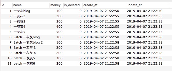 [{id=1, name=一灰灰blog, money=100, is_deleted=false, create_at=2019-04-08 10:22:50.0, update_at=2019-04-08 10:22:50.0}, {id=2, name=一灰灰2, money=200, is_deleted=false, create_at=2019-04-08 10:22:55.0, update_at=2019-04-08 10:22:55.0}, {id=3, name=一灰灰3, money=300, is_deleted=false, create_at=2019-04-08 10:22:55.0, update_at=2019-04-08 10:22:55.0}, {id=4, name=一灰灰4, money=400, is_deleted=false, create_at=2019-04-08 10:22:55.0, update_at=2019-04-08 10:22:55.0}, {id=5, name=一灰灰5, money=500, is_deleted=false, create_at=2019-04-08 10:22:55.0, update_at=2019-04-08 10:22:55.0}]