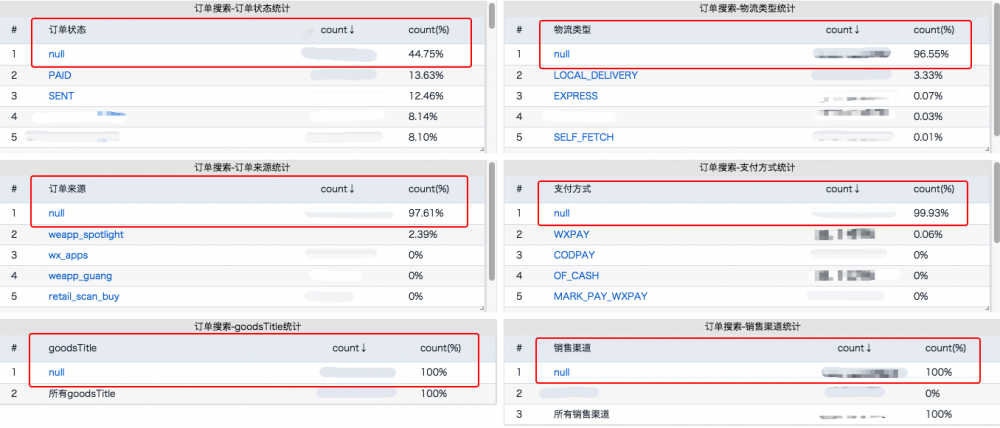 而细化了下这 53% 的订单状态搜索中,其中 3% 左右搜索终态订单(已完成,已关闭),其中 50% 所有流量全部都是搜热状态订单(待付款,待发货,待成团,待接单,已发货),-_- 忽略比较乱的枚举,历史多个版本统计合一。