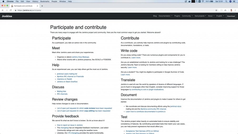 要成为 Jenkins 的贡献者,首先会看到的就是 jenkins.io , 在顶部导航中"社区"下拉列表里第一个"参与"的链接就能将我们带到"参与和贡献"这个页面。