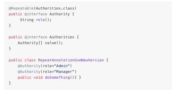 创建重复注解Authority时,加上@Repeatable,指向存储注解Authorities,在使用时候,直接可以重复使用Authority注解。