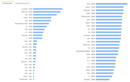 语言好恶方面, 最招人喜欢的是Rust,83%的开发者都报以好感 ;其次是Python和TypeScipt。